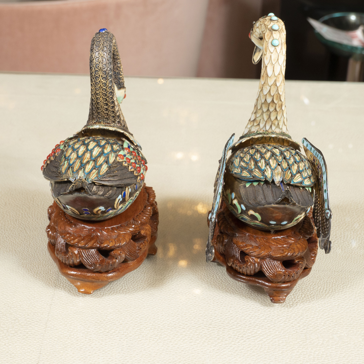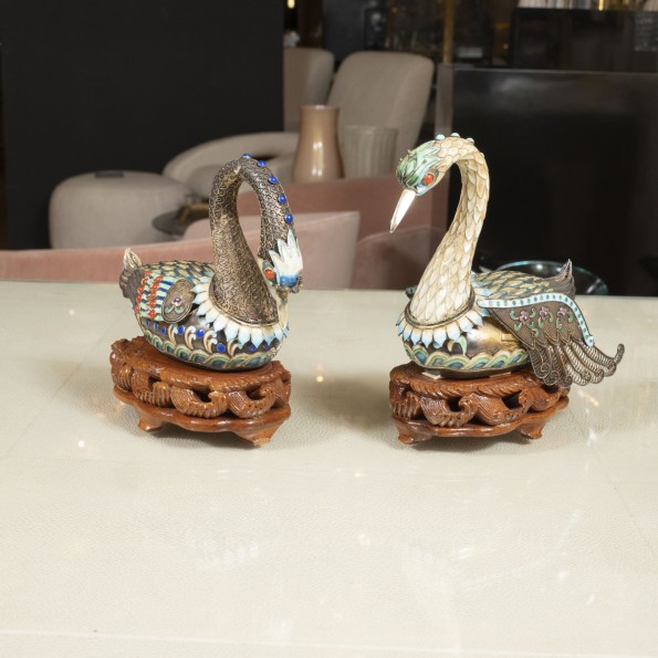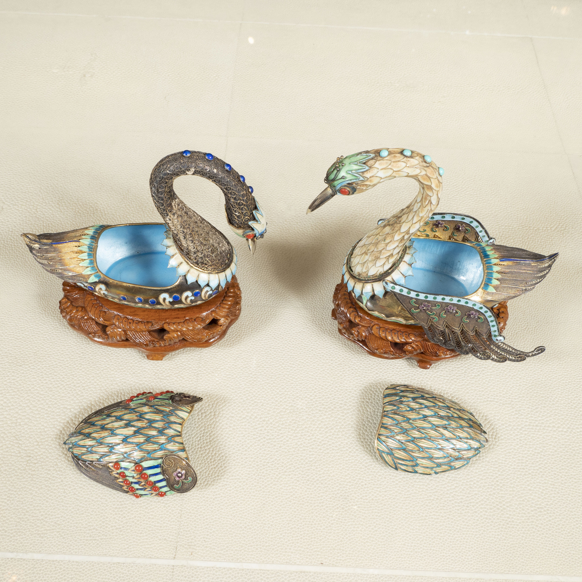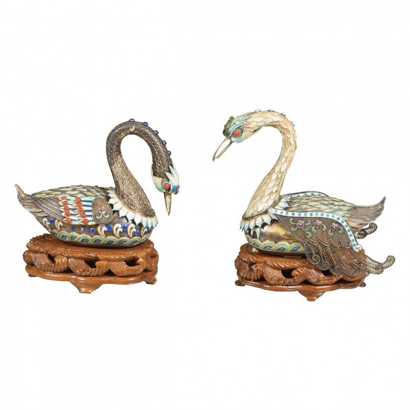 Pair of enameled metal sawn form boxes
