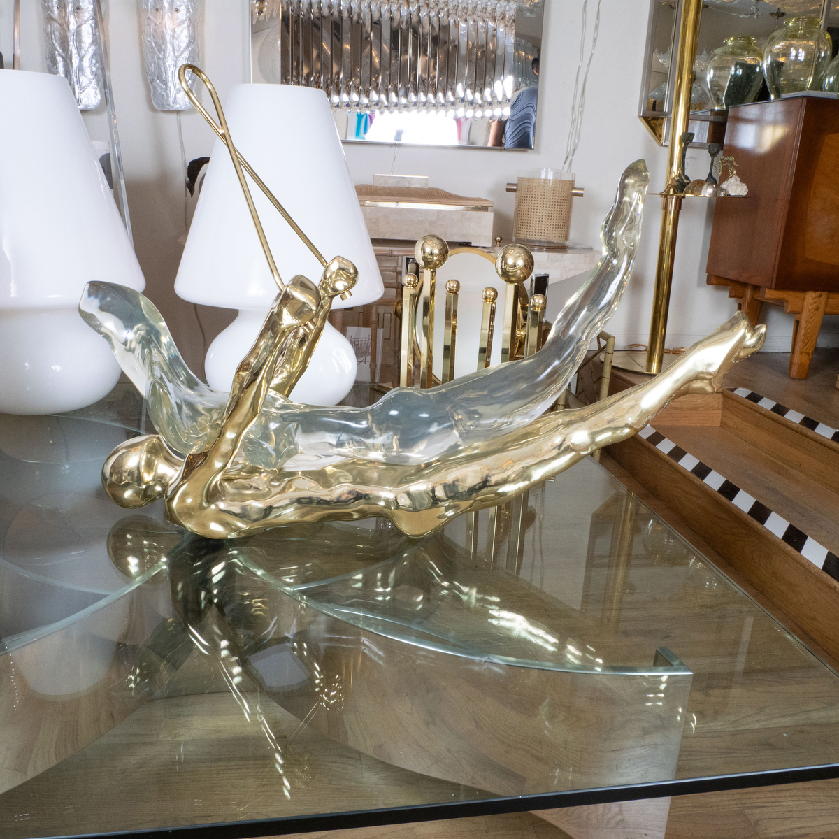 Brass and lucite swinging gymnast sculpture