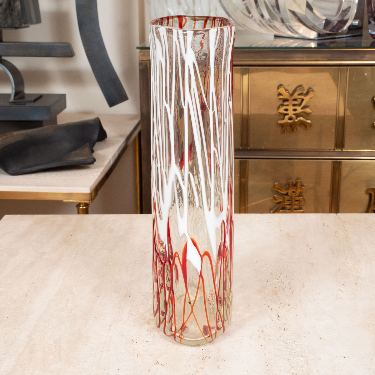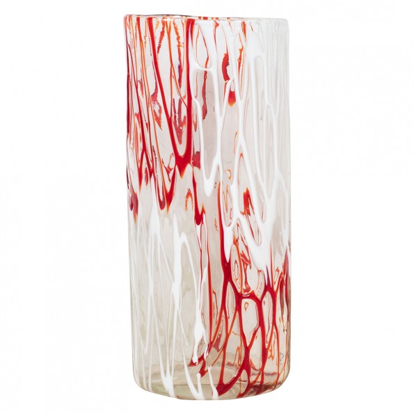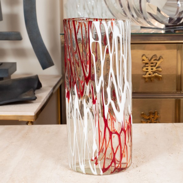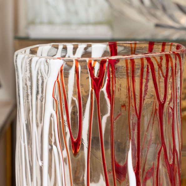 Clear Murano tall vase with red and white design