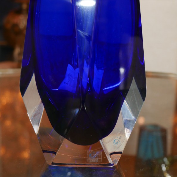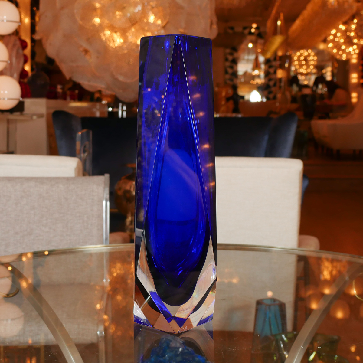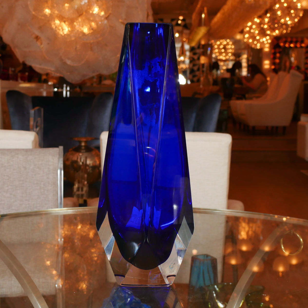 Tall facet cut Murano glass vase with cobalt blue sommerso core