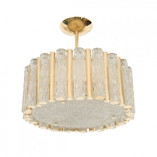 Brass drum form pendant fixture with tubular glass shades by Doria