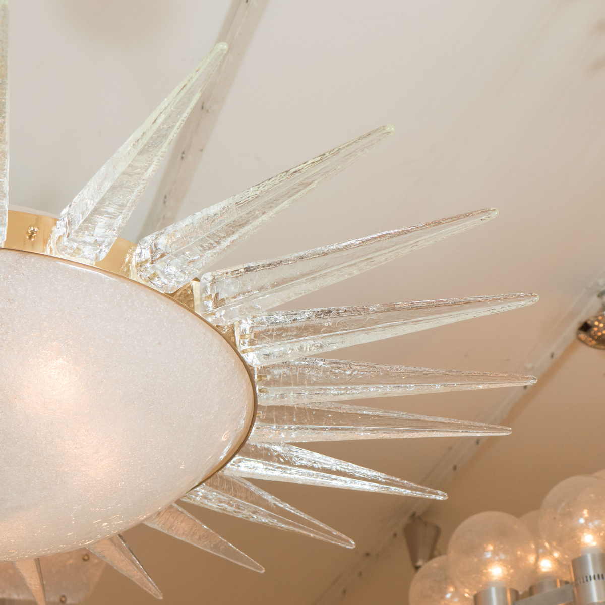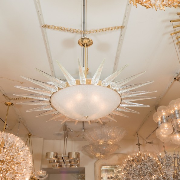 Saucer form frosted glass sunburst pendant ceiling fixture by John Salibello