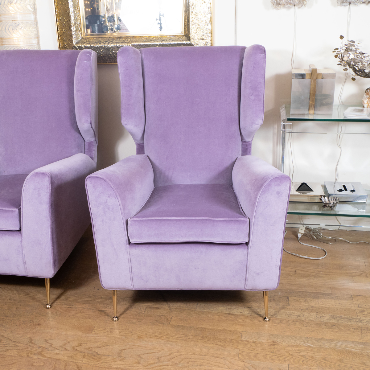 Pair of upholstered wing back armchairs