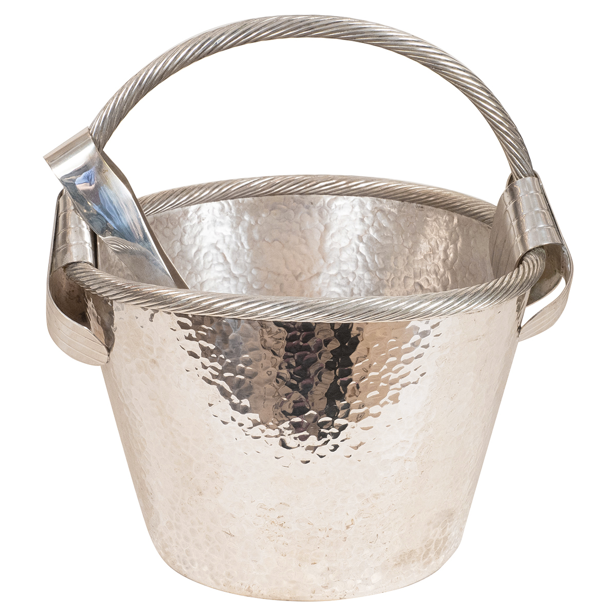 Repoussed silver plated ice bucket and tongs