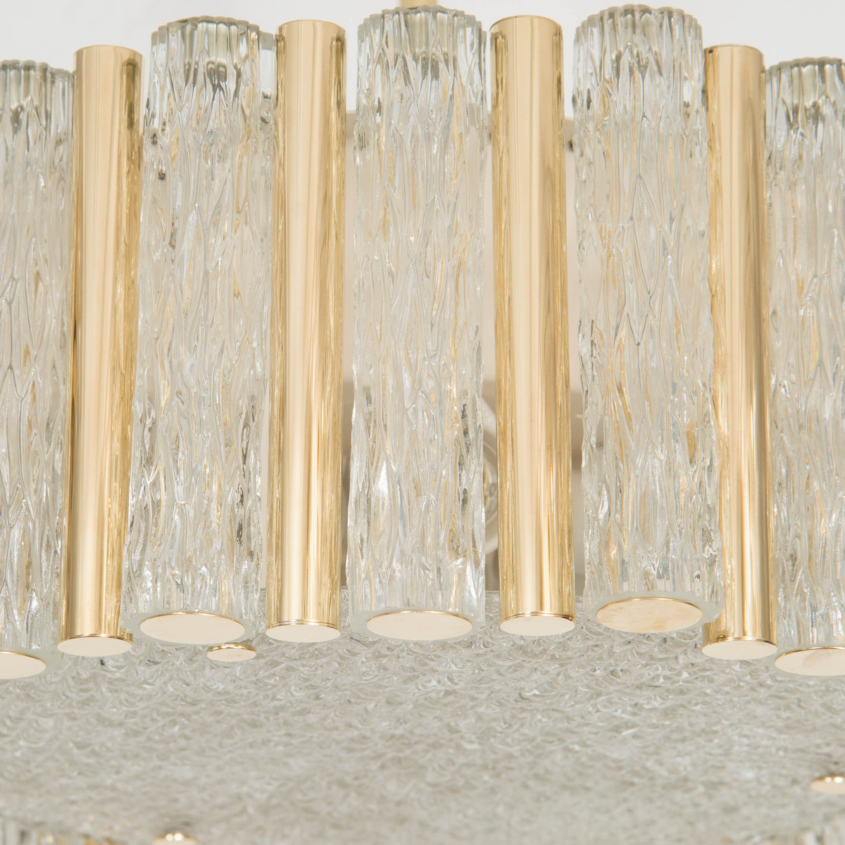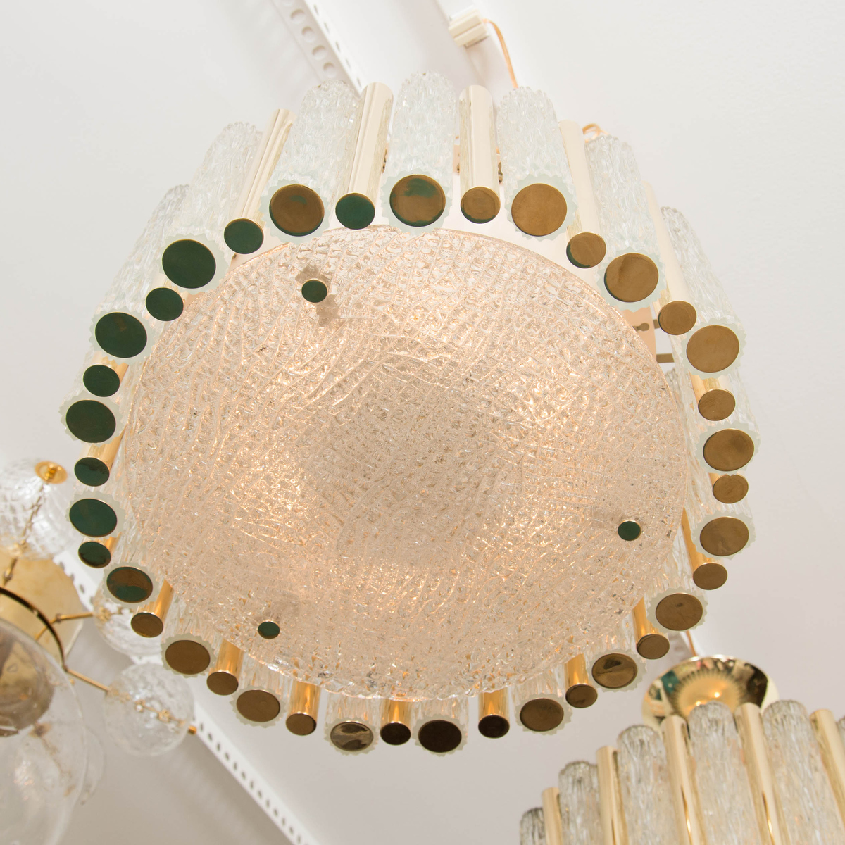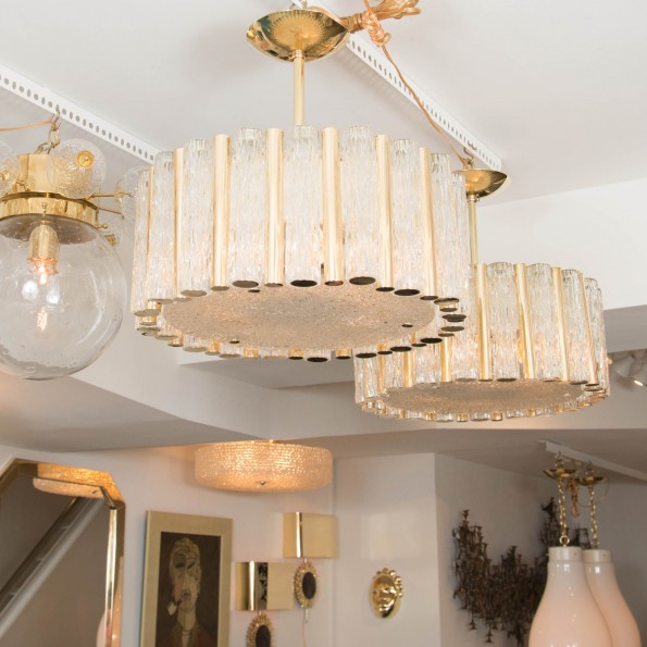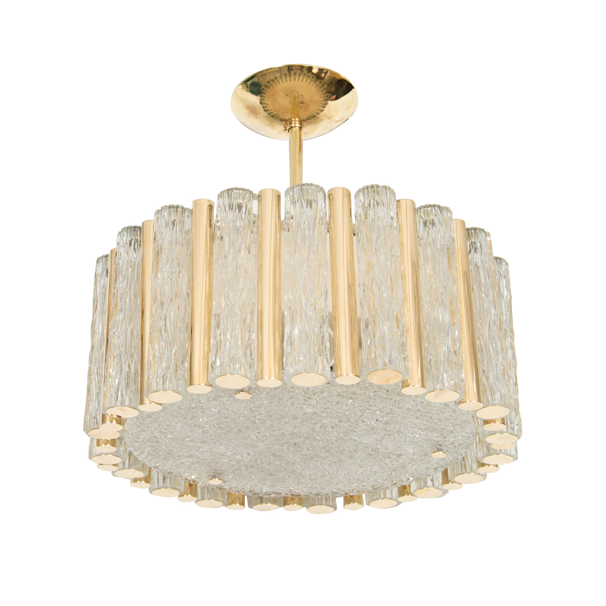 Brass drum form pendant fixture with tubular glass shades by Doria