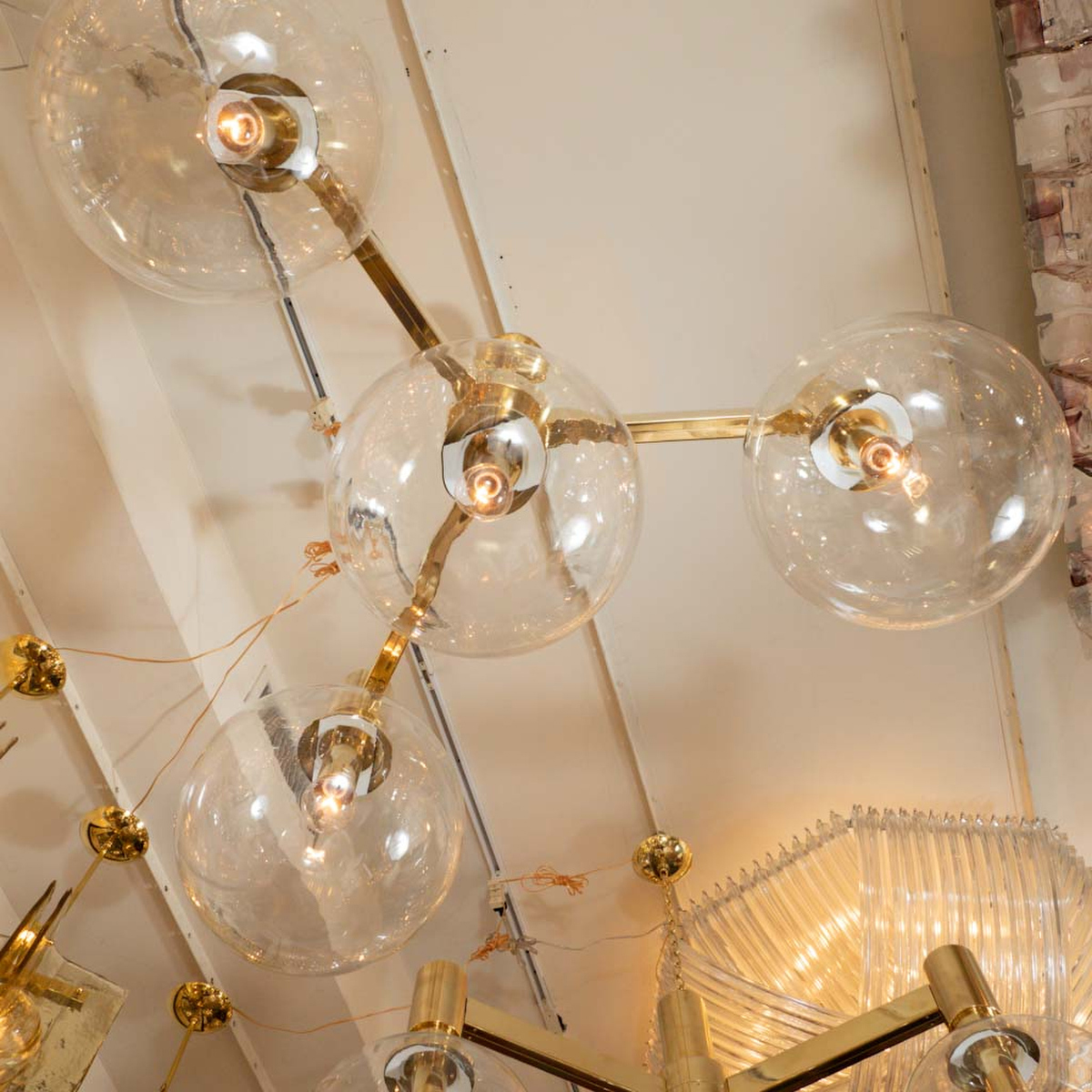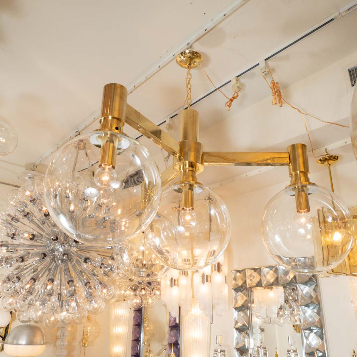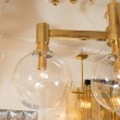 Brass three arm chandelier with clear glass spherical shades