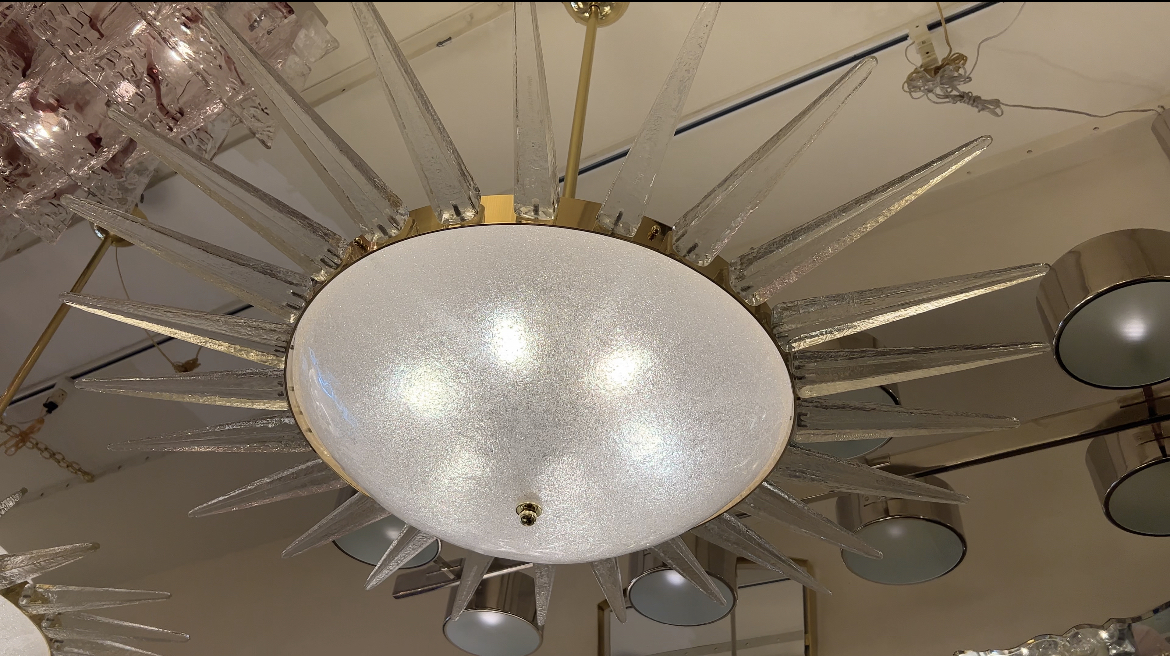Saucer form frosted glass sunburst pendant ceiling fixture by John Salibello