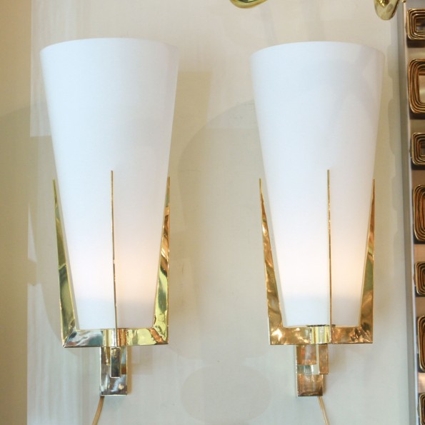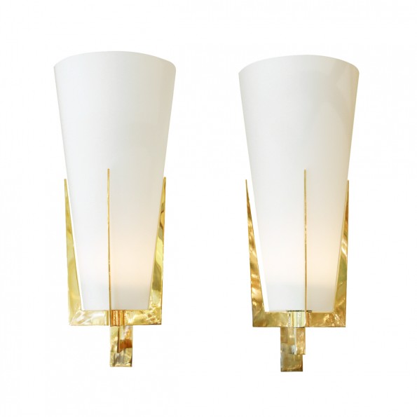 Pair of brass sconces with conical frosted glass shades by Stilnovo