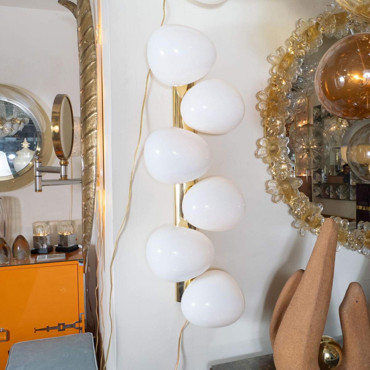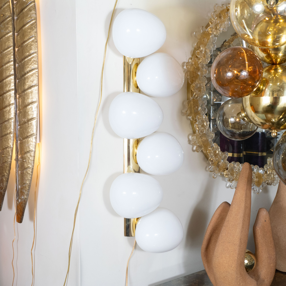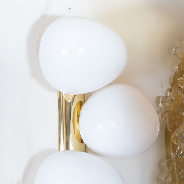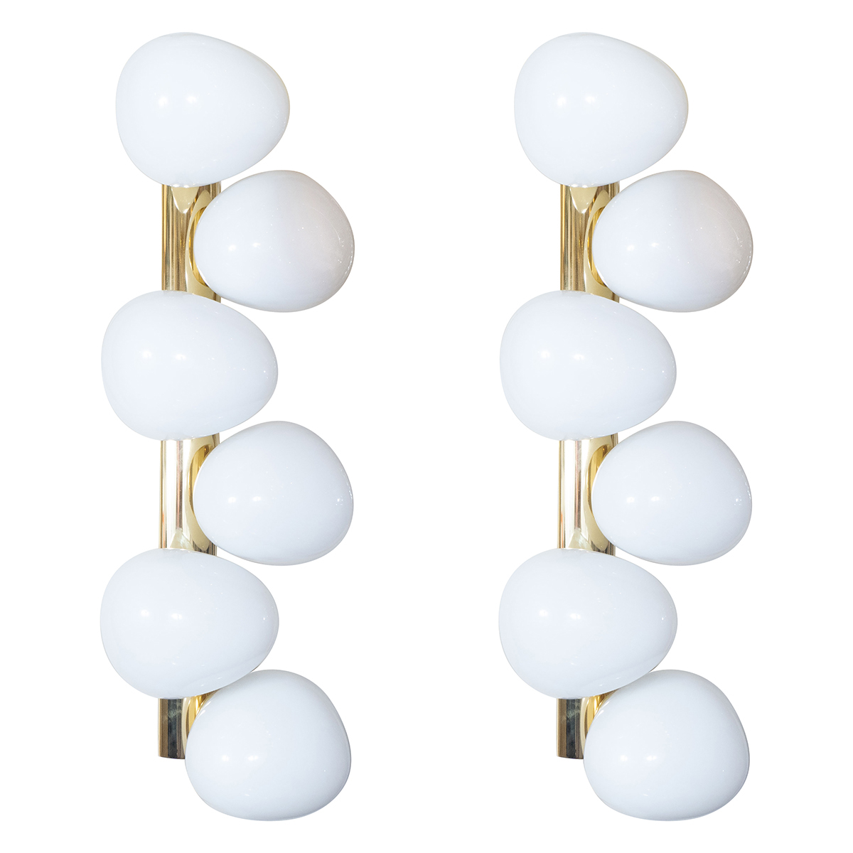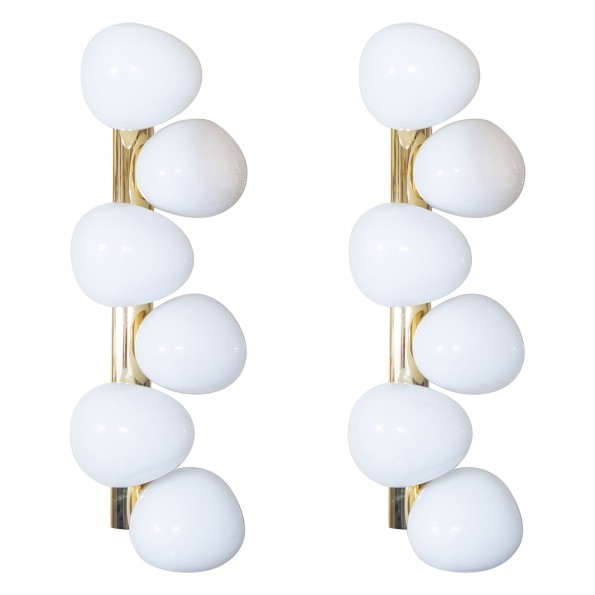 Pair of brass sconces with ovoid opaque shades