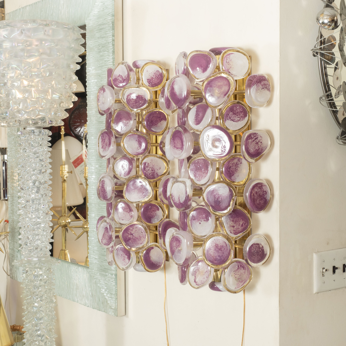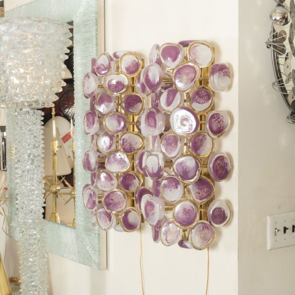 Pair of brass sconces with purple disks