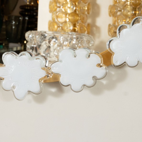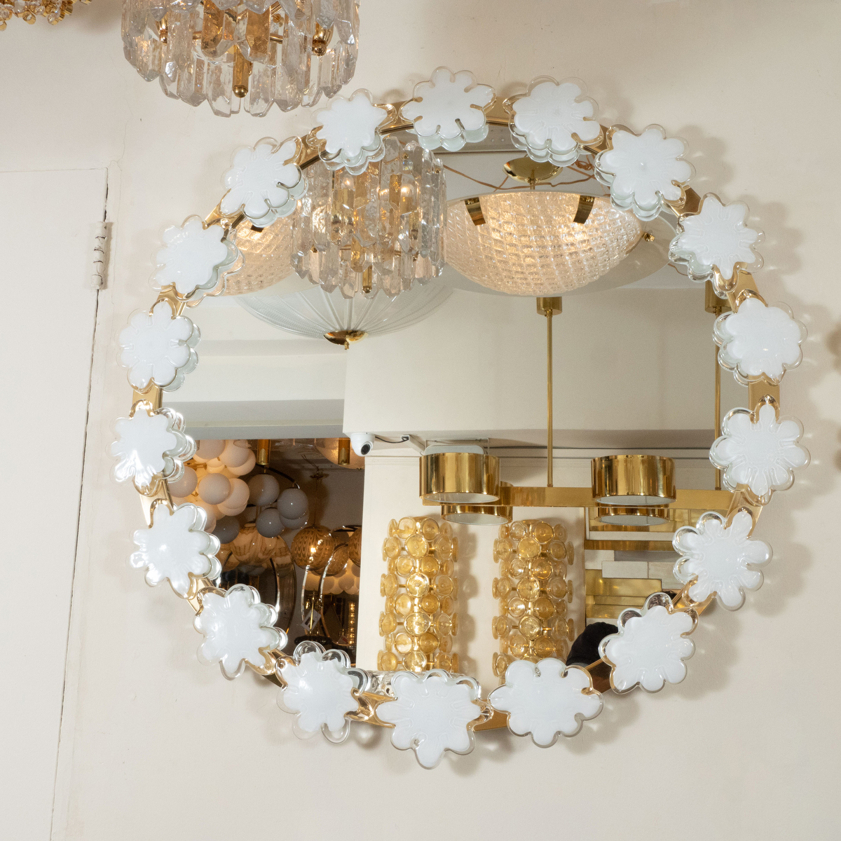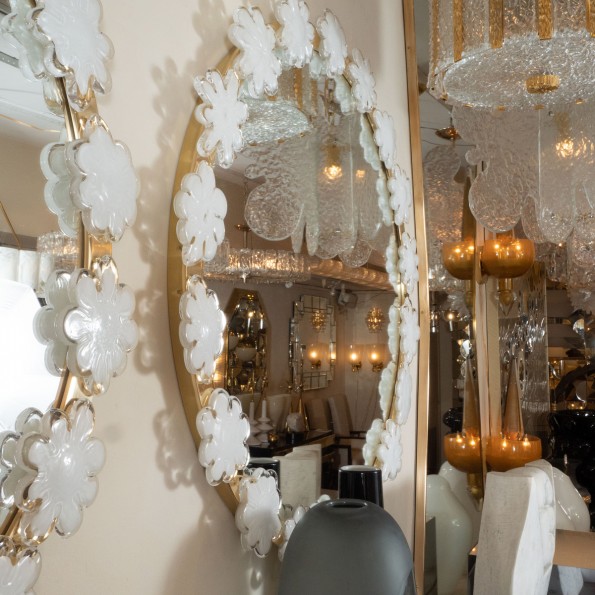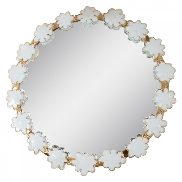 Circular brass mirror with white flower surround