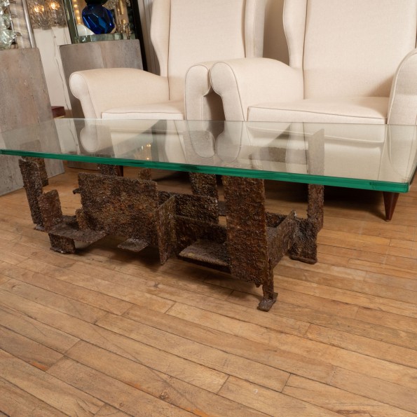 Rectangular coffee table with glass top and iron base by Paul Evans