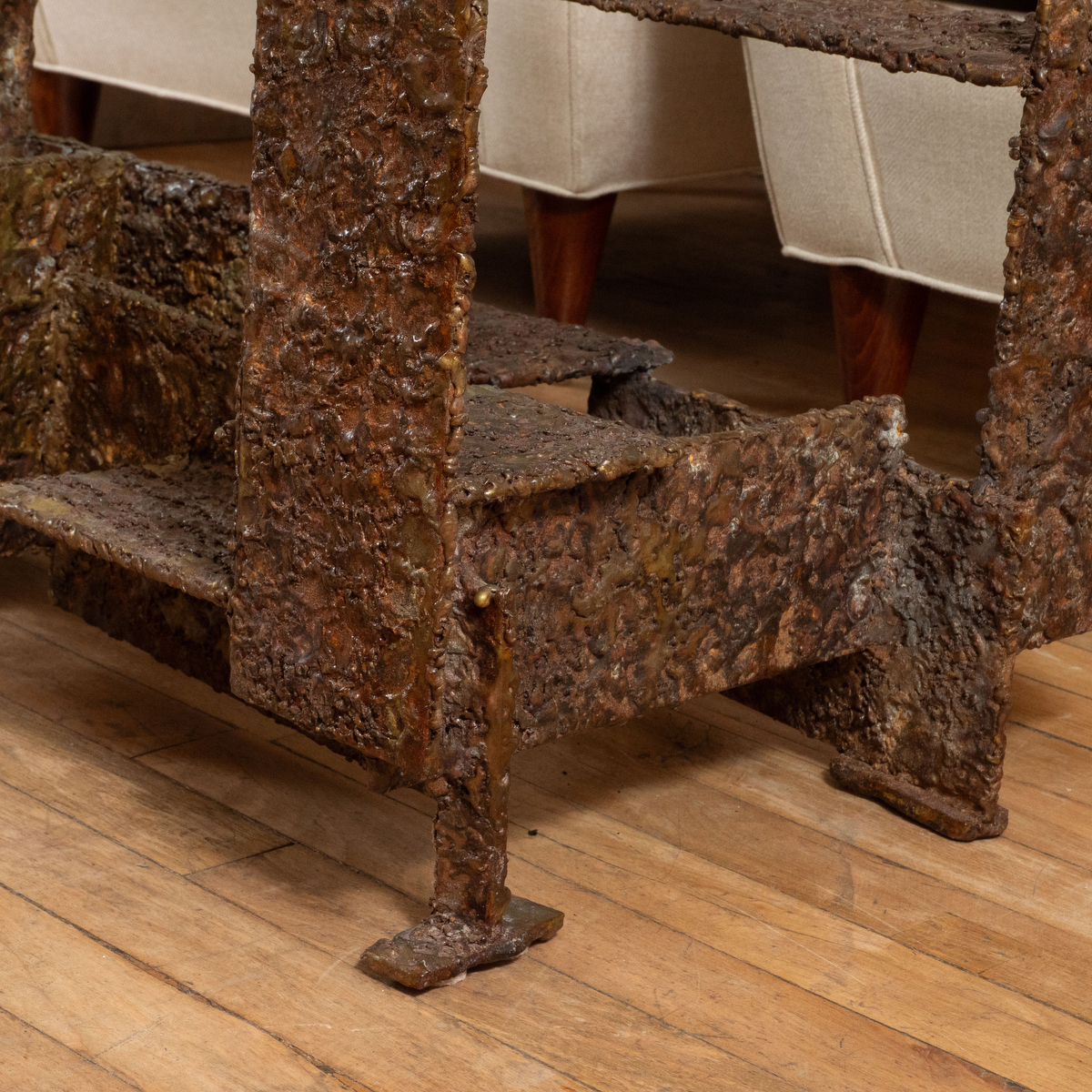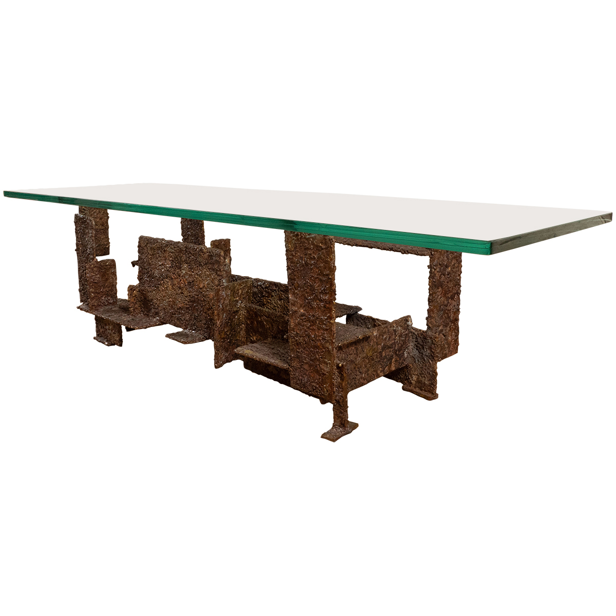 Rectangular coffee table with glass top and iron base by Paul Evans