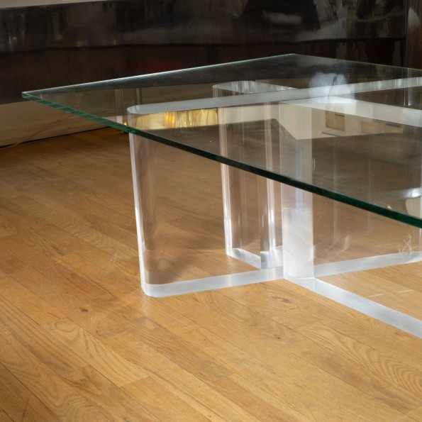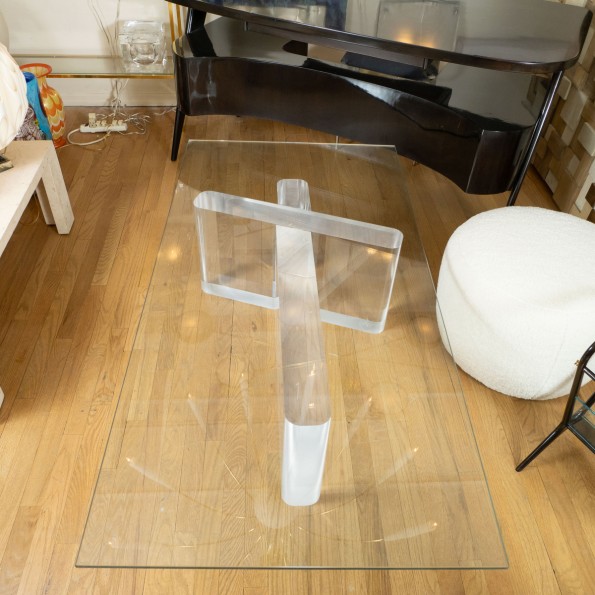 Rectangular glass coffee table with lucite "cross" by Lion in Frost