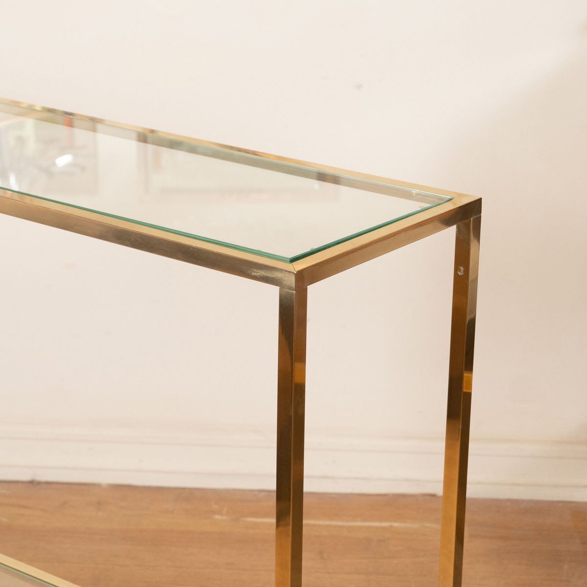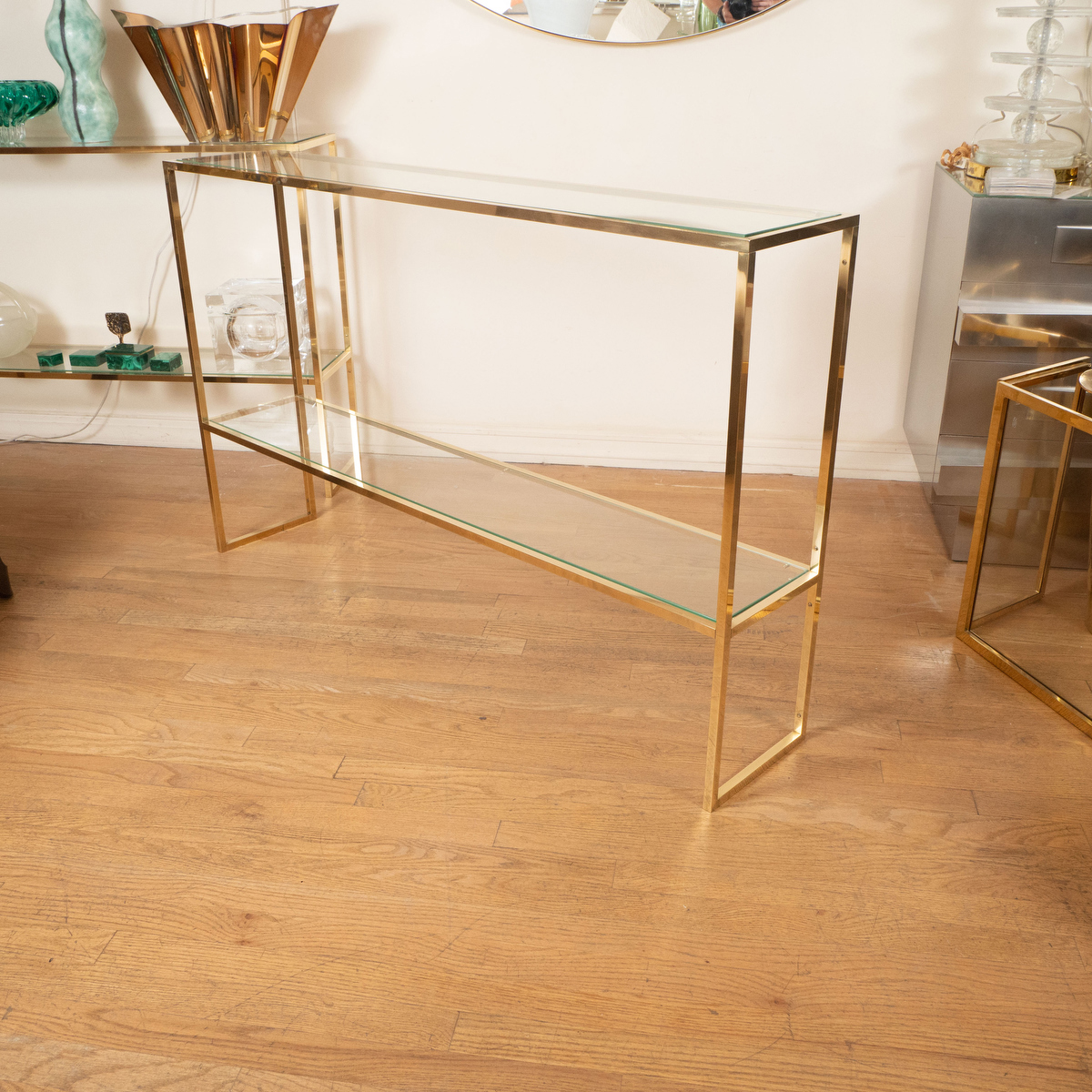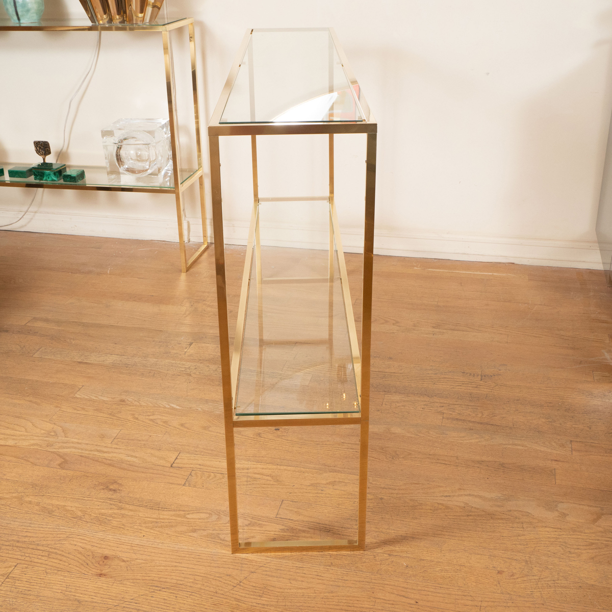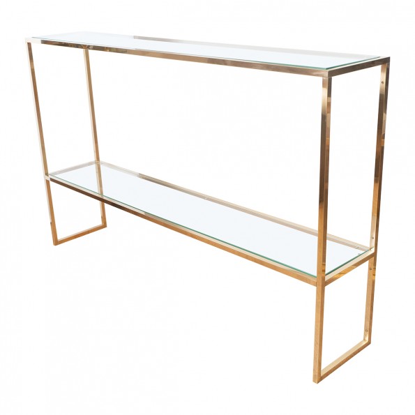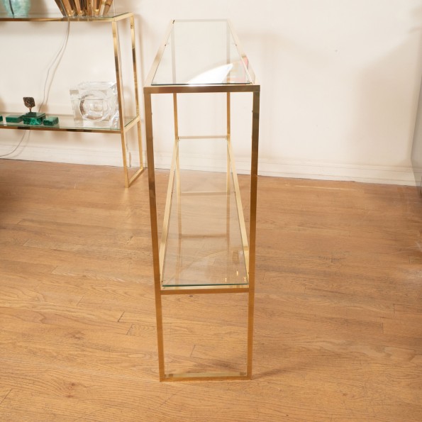 Slender brass and glass two shelf console