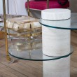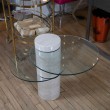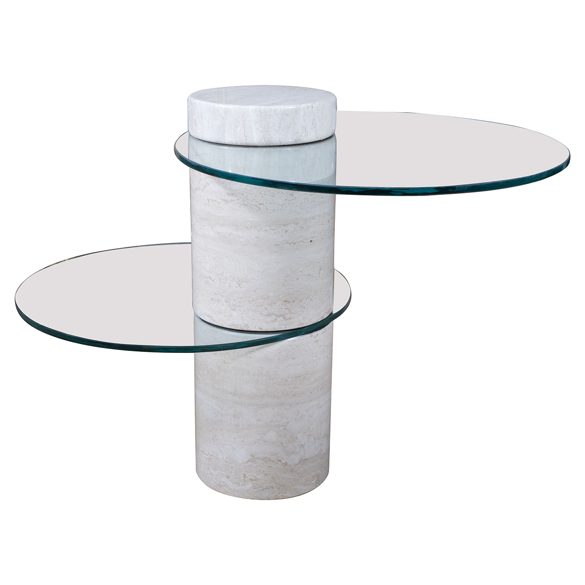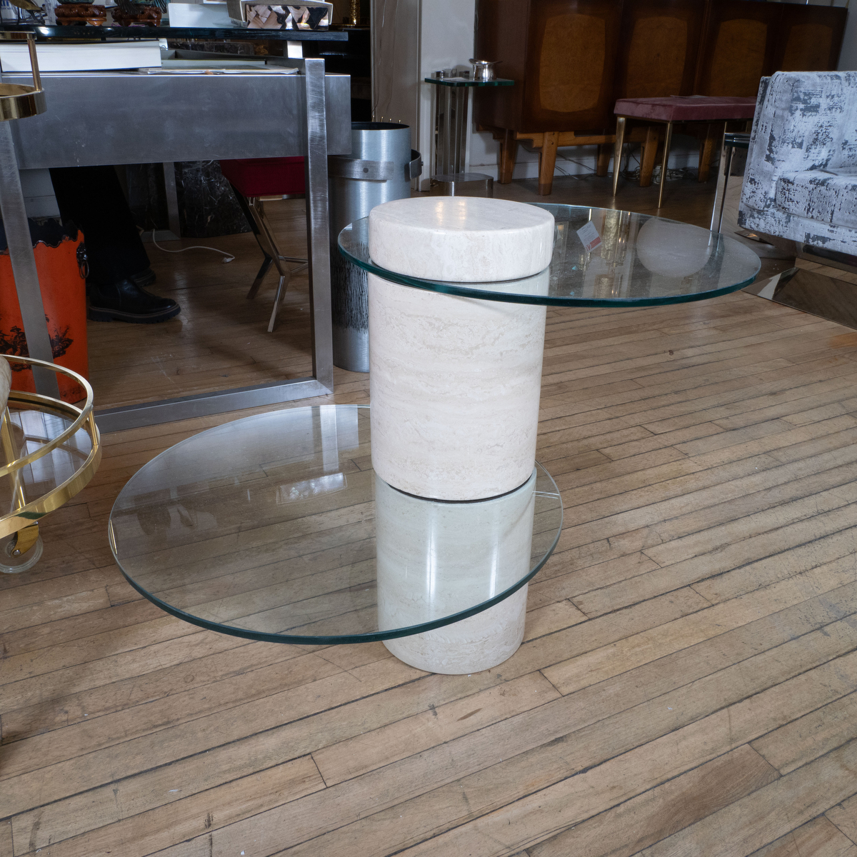 Cantilevered travertine and glass side table