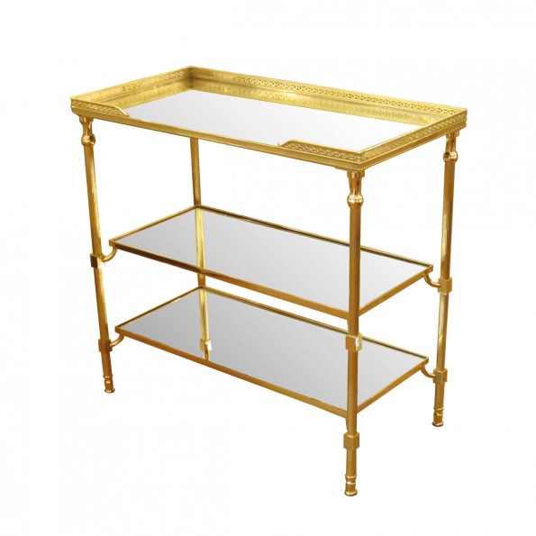 Pair of three tiered brass and mirror side tables with decorative gallery