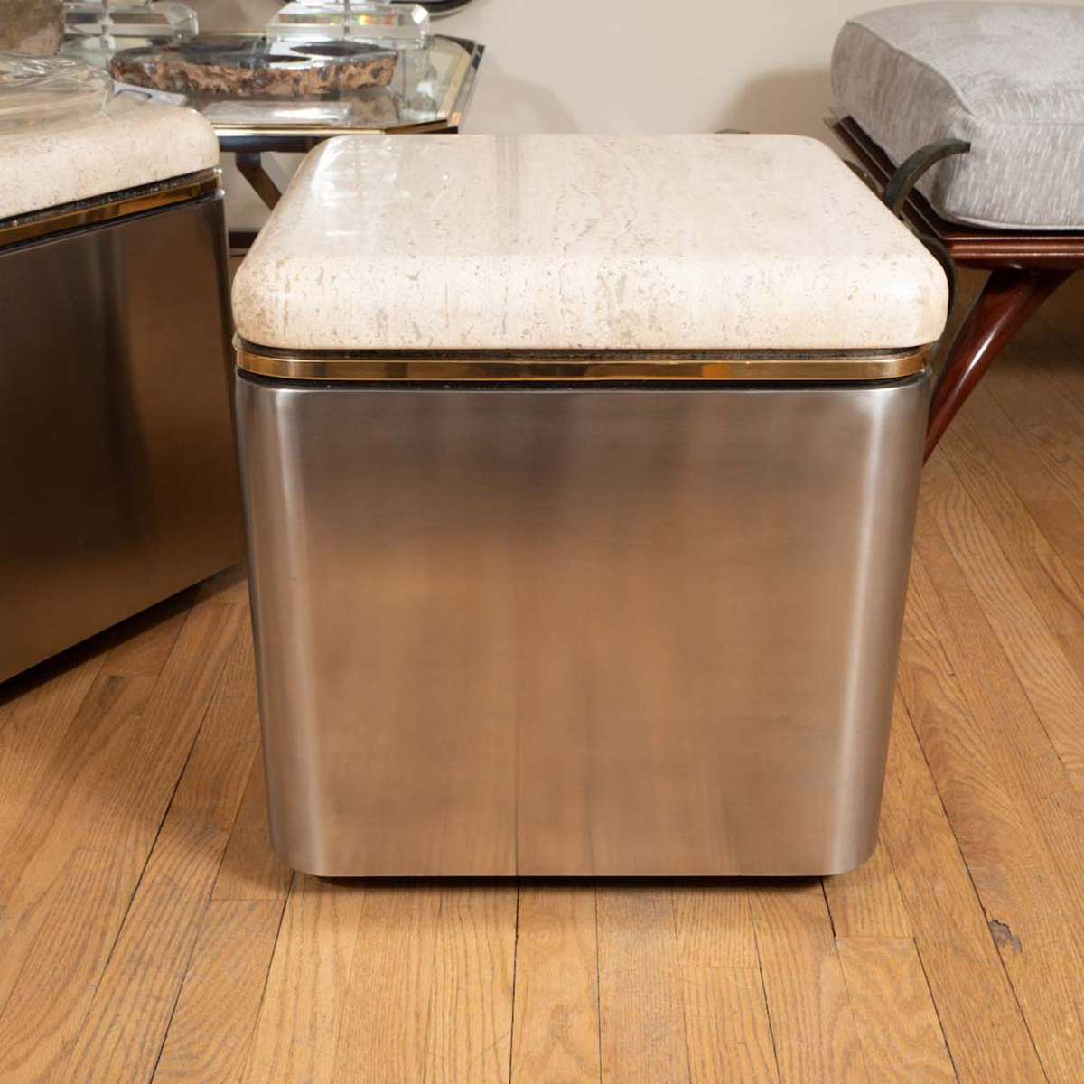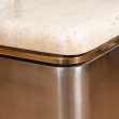 Square nickel rolling side table with travertine top
